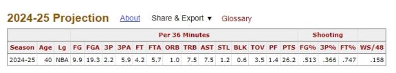 巴黎奥运会,詹姆斯荣膺赛会男篮MVP知名数据网站BBR预测詹姆斯新赛季数据:每36分钟26.2分7.5篮板7.5助攻1.2抢断,投篮命中率是51.3%,三分命中率为36.6%,罚球命中率是74.7%;詹姆斯2023-24赛季数据:场均上阵35.3分钟,拿下25.7分7.3篮板8.3助攻1.3抢断,投篮命中率为54.0%,三分命中率是41.0%,罚球命中率为75.0%。